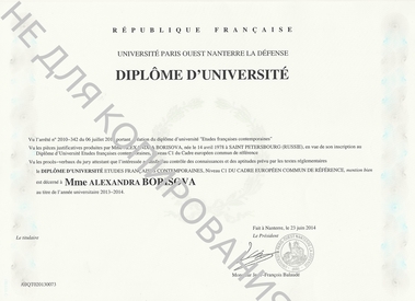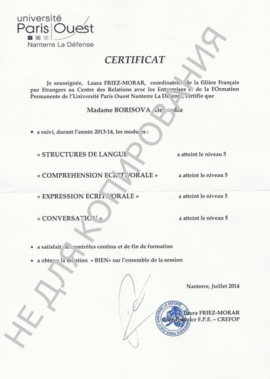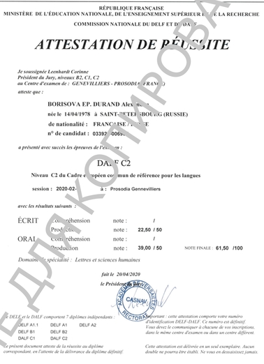 Имею диплом вышего уровня владения языком - Dalf C2, а также диплом методиста французского языка Alliance Française, дающий право преподавать французский во всем мире.